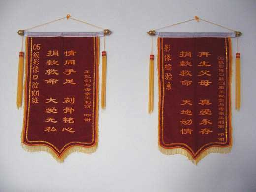 廣大社會愛心人士紛紛伸出援手,共籌集善款一萬余元,同學們將這些愛心基金送到了王配劍母親手中。為表示感激之情,王配劍母親贈送學院3面錦旗,并親手書寫感謝信。