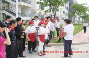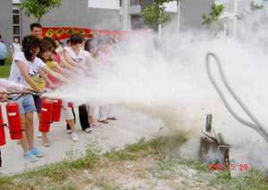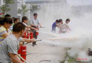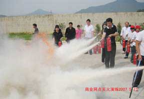 6.為促進(jìn)商業(yè)網(wǎng)點(diǎn)、食堂全體職工對(duì)消防知識(shí)的了解,提高消防安全意識(shí),保護(hù)人身安全,將損失減少到最低限度, 2007年5月15日下午,保衛(wèi)處組織進(jìn)行滅火器使用培訓(xùn)和現(xiàn)場(chǎng)油盆滅火演練,共使用滅火器70個(gè),參加人數(shù)近百人。