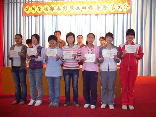 大會(huì)在雄壯的國(guó)歌聲中拉開(kāi)了序幕,陳潔老師首先宣讀2006-2007學(xué)年第一學(xué)期衛(wèi)生模范宿舍、先進(jìn)個(gè)人表彰決定,上學(xué)期我部共評(píng)出6個(gè)衛(wèi)生模范宿舍和129名先進(jìn)個(gè)人。隨后進(jìn)行頒獎(jiǎng)儀式,受表彰的衛(wèi)生模范宿舍和先進(jìn)個(gè)人代表上臺(tái)領(lǐng)獎(jiǎng),06級(jí)涉外護(hù)理501班謝慧林同學(xué)與5404宿舍舍長(zhǎng)陳潔玉同學(xué)作為先進(jìn)個(gè)人與衛(wèi)生模范宿舍代表分別發(fā)言。洪聿榮書(shū)記在接下來(lái)的講話中希望我系廣大同學(xué)要珍惜榮譽(yù)、志存高遠(yuǎn)、勤奮好學(xué),不斷提高自身的綜合素質(zhì),同時(shí),他對(duì)前階段開(kāi)展的“文明修身”系列活動(dòng)進(jìn)行了系統(tǒng)總結(jié),號(hào)召?gòu)V大同學(xué)持之以恒,養(yǎng)成良好行為習(xí)慣,用文明譜寫(xiě)青春之歌,讓青春與文明同行。最后,學(xué)工處鄭力宏處長(zhǎng)在講話中向受到表彰的衛(wèi)生模范宿舍與先進(jìn)個(gè)人表示祝賀,對(duì)我系開(kāi)展的“文明修身”系列活動(dòng)給予了充分的肯定,并勉勵(lì)廣大同學(xué)不斷努力,爭(zhēng)取更大進(jìn)步!