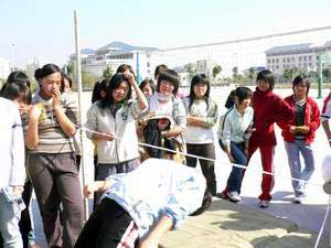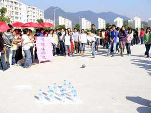 2007年2月6日下午陽光明媚,由福建衛(wèi)生職業(yè)技術(shù)學院學生會主辦,藥學系學生會承辦的福建衛(wèi)生職業(yè)技術(shù)學院“迎新春”趣味活動在院體育場舉行,學工處鄭力宏處長、團委邱滾忠老師、藥學系歐春木書記等領(lǐng)導出席,邱滾忠老師代表學院講了話,他帶來了院領(lǐng)導的關(guān)懷,對藥學系承辦此次活動所付出的辛苦表示感謝,并預祝活動圓滿成功。藥學系歐春木書記就此次活動的籌備做了講話。此次活動有來自各系部的15支代表隊,345名運動會參加,活動的項目有情牽一線、移磚過河、齊心協(xié)力、可樂保齡球、腰力大比拼、團體拔河等,各系部組織了強有力的啦啦隊現(xiàn)場比拼,活動熱浪一潮高過一潮。冬天的太陽雖然不烈,但運動員個個仍汗流浹背,此次活動還吸引了數(shù)千名的體育愛好者。這是我院在緊張的期末復習考試期間進行的又一次心情大調(diào)節(jié),此類活動深受學生的喜愛。