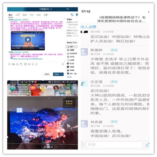 (圖為思政教師組織學(xué)生觀看抗擊疫情視頻,并與學(xué)生們開展線上互動討論)