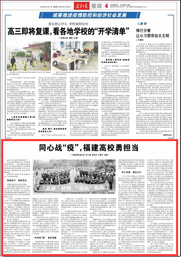 這是一場只能贏不能輸?shù)膽?zhàn)斗。 從醫(yī)療救治到馳援一線,從檢測研發(fā)到科學(xué)預(yù)防……自新冠肺炎疫情發(fā)生以來,我省高校積極投身、統(tǒng)籌推進(jìn)疫情防控和經(jīng)濟(jì)社會發(fā)展,與全省人民同舟共濟(jì),揚(yáng)起命運(yùn)與共、共克時艱的精神風(fēng)帆。 面對疫情,迎難而上!我省高校交出了一份出色的答卷! 英雄逆行 高校擔(dān)當(dāng) 關(guān)鍵時刻挺身而出的,是英雄。 在這次教育系統(tǒng)防疫戰(zhàn)役中,高校的力量舉足輕重,高校師生不僅守好了校園,還沖在了防疫第一線。我省多家高校附屬醫(yī)院積極參加援鄂醫(yī)療隊(duì)、承擔(dān)省內(nèi)防疫醫(yī)療任務(wù),成為抗擊疫情的重要生力軍! “不忘初心,完成使命,平安歸來!”3月24日,作為福建省首批支援湖北醫(yī)療隊(duì)隊(duì)員歸來的林忠厚感慨地說。 大年初二,得知福建省組建援鄂醫(yī)療隊(duì),福建醫(yī)科大學(xué)附屬第一醫(yī)院急診科副護(hù)士長林忠厚第一時間向院黨委遞交“請戰(zhàn)書”。大年初三,他辭別父母和妻兒,隨團(tuán)馳援武漢。在武漢金銀潭醫(yī)院,林忠厚作為小組長負(fù)責(zé)綜四病區(qū)工作。他不怕苦、不怕累,每天都沖鋒在第一線、戰(zhàn)斗在最前沿。 據(jù)了解,新冠肺炎疫情發(fā)生后,福建醫(yī)科大學(xué)積極響應(yīng)黨中央的號召,按照省委省政府的要求,充分發(fā)揮學(xué)科專業(yè)優(yōu)勢,積極履行服務(wù)社會、服務(wù)師生的使命與擔(dān)當(dāng)?!敖刂?月28日,學(xué)校附屬醫(yī)院已累計(jì)有385名醫(yī)護(hù)人員前往湖北進(jìn)行支援,他們舍小家為大家,義無反顧逆行而上?!备=ㄡt(yī)科大學(xué)黨委副書記黃愛民說。 “專業(yè)對口,無怨無悔。”“大家不要爭了,我身體最壯,我去最適合!”“國家需要,義不容辭!”……接到上級通知,福建中醫(yī)藥大學(xué)附屬醫(yī)院的醫(yī)護(hù)人員主動請戰(zhàn)一線。 據(jù)了解,福建中醫(yī)藥大學(xué)四家直屬附屬醫(yī)院共分批派出102名醫(yī)護(hù)人員增援武漢、宜昌,弘揚(yáng)大醫(yī)精神、貢獻(xiàn)中醫(yī)智慧,在湖北抗疫一線發(fā)揮了重要作用?!案=ㄖ嗅t(yī)人充分發(fā)揮了中醫(yī)藥在疫情防控方面的特色優(yōu)勢,并取得了良好的療效,得到了兄弟省份和同行的廣泛好評。此外,學(xué)校還充分發(fā)揮專家作用,通過遠(yuǎn)程會診等形式,為戰(zhàn)勝疫情獻(xiàn)策獻(xiàn)力?!备=ㄖ嗅t(yī)藥大學(xué)校長李燦東教授告訴記者。 “我曾在武漢求學(xué),此去更加義無反顧。”這是福建省首批馳援武漢的廈門大學(xué)附屬第一醫(yī)院醫(yī)生趙貫金出征前的誓言,他說,支援武漢的消息一經(jīng)傳出,他就毫不猶豫地寫下了請戰(zhàn)書。 從三尺講臺到戰(zhàn)“疫”陣地,從各自崗位到武漢前線,師生校友化身戰(zhàn)士,高校學(xué)府皆成砥柱,筑起了守護(hù)生命的白衣長城。 科學(xué)戰(zhàn)“疫” 高校智慧 戰(zhàn)勝疫情離不開科技支撐。在這場疫情防控阻擊戰(zhàn)中,我省高校沖在疫情防控、臨床診治、科學(xué)研究的第一線,勇于擔(dān)當(dāng)、積極作為,取得重要階段性成果,充分體現(xiàn)了近年來我省推進(jìn)高??萍俭w制機(jī)制改革創(chuàng)新的成效。 “一滴指尖血,十分鐘檢測?!?月10日,福州大學(xué)宣布,該校與廈門寶太生物科技有限公司合作研發(fā)的新冠病毒檢測試劑盒獲歐盟CE準(zhǔn)入,將正式投放歐洲市場,月產(chǎn)能可達(dá)300萬人份以上! “該試劑盒采用膠體金法,具有很高的靈敏度和特異性,可用于體外定性檢測血漿、全血樣本中的SARS-CoV-2冠狀病毒IgG/IgM抗體。產(chǎn)品即采即測,無需輔助儀器,可肉眼判斷,10分鐘即可得出檢測結(jié)果?!备V荽髮W(xué)食品安全與生物分析教育部重點(diǎn)實(shí)驗(yàn)室、福建省健康智能診斷技術(shù)工程研究中心林振宇教授表示。目前試劑盒已在福建三家定點(diǎn)醫(yī)院經(jīng)過初步臨床驗(yàn)證,“下一步,我們的目標(biāo)是產(chǎn)品能在國內(nèi)市場上市”。 無獨(dú)有偶,3月6日,廈門大學(xué)國家傳染病診斷試劑與疫苗工程技術(shù)研究中心夏寧邵團(tuán)隊(duì)等聯(lián)合研制的新型冠狀病毒(2019-nCoV)抗體檢測試劑盒,也正式獲準(zhǔn)上市并已完成產(chǎn)業(yè)化,月產(chǎn)能超100萬人份。據(jù)了解,這也是國內(nèi)外首個獲批的雙抗原夾心法總抗體檢測試劑。 “新冠病毒檢測試劑盒,具有靈敏度高、特異性好、隨到隨檢、全自動高通量、29分鐘出結(jié)果等優(yōu)點(diǎn),結(jié)合核酸檢測,可用于臨床病例和疑似病例的檢測以及特殊高危人群的篩查,大大提高了一線醫(yī)療機(jī)構(gòu)的檢測效率?!睆B門大學(xué)相關(guān)研究人員表示。 早預(yù)防,是打贏疫情防控阻擊戰(zhàn)的關(guān)鍵之一。面對疫情,我省各高校綜合運(yùn)用多種手段,加強(qiáng)對新冠肺炎的預(yù)防。 福建高校網(wǎng)上紅色書屋推出疫情防控專欄,上架《新型冠狀病毒肺炎預(yù)防手冊》《新型肺炎權(quán)威解讀》等67本疫情防護(hù)相關(guān)圖書,普及疫情防控專業(yè)知識,得到學(xué)生的追捧。 閩江學(xué)院、莆田學(xué)院等高校創(chuàng)立“防疫知識驛站”,建立《以愛防疫,“易”起同行》公開課群,集中開展防疫知識宣傳和展示,累計