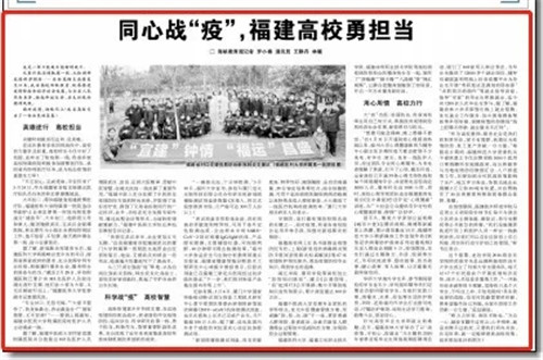 海峽教育報訊 4月2日,《福建日報》第四版刊發(fā)了《同心戰(zhàn)“疫”》文章,介紹了我省高校從醫(yī)療救治到馳援一線,從檢測研發(fā)到科學(xué)預(yù)防……面對疫情,迎難而上,交出了一份出色的答卷!