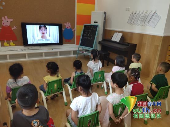 圖為線上直播教學(xué)志愿者教學(xué)視頻在家鄉(xiāng)幼兒園展播,宣傳《弟子規(guī)》知識(shí)。中國青年網(wǎng)通訊員 蔡小華 供