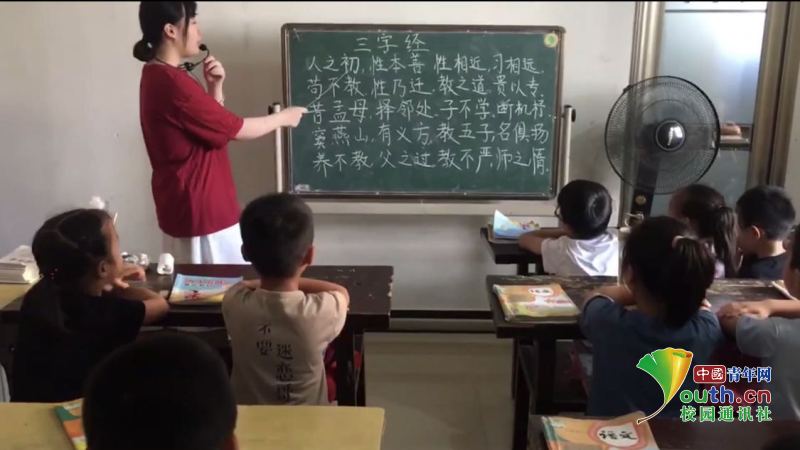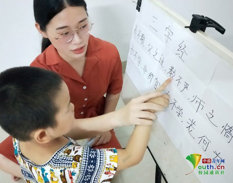 圖為志愿者耐心教小朋友讀寫《三字經(jīng)》內(nèi)容。中國青年網(wǎng)通訊員 蔡小華 供