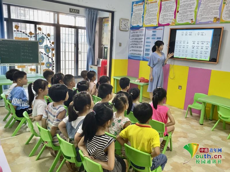 圖為志愿者在家鄉(xiāng)社區(qū)幼兒園宣傳《百家姓》知識(shí)。中國青年網(wǎng)通訊員 蔡小華 攝