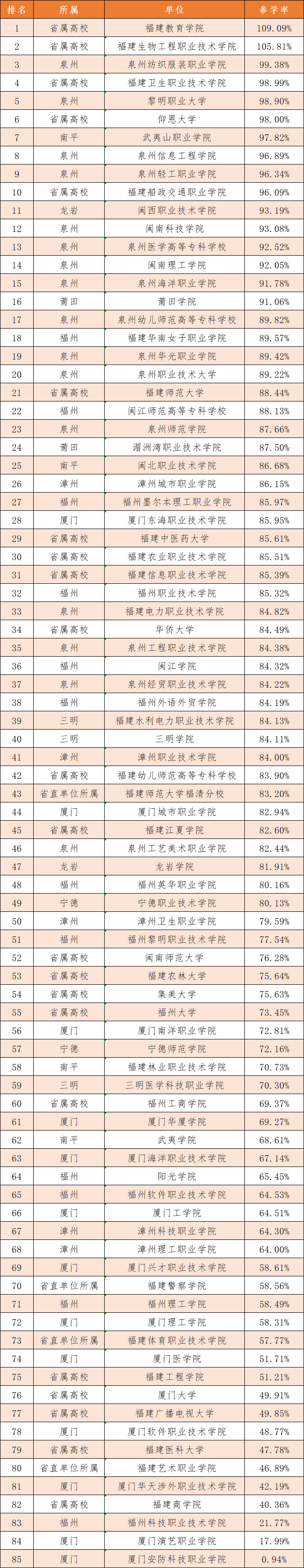 第九季第十三期“青年大學(xué)習(xí)”網(wǎng)上主題團(tuán)課,高校團(tuán)委中共有49所學(xué)校參學(xué)率達(dá)到80%,對以下各高校的團(tuán)組織提出表揚(yáng):福建教育學(xué)院本周109.09%參學(xué)率獲得第一名,參學(xué)率最高。福建生物工程職業(yè)學(xué)院獲得第二名。排名第三至第五名分別泉州紡織服裝職業(yè)學(xué)院、福建衛(wèi)生職業(yè)技術(shù)學(xué)院、黎明職業(yè)大學(xué),排名第六名至第十名為仰恩大學(xué)、武夷山職業(yè)學(xué)院、泉州信息工程學(xué)院、泉州輕工職業(yè)學(xué)院、福建船政交通職業(yè)學(xué)院。