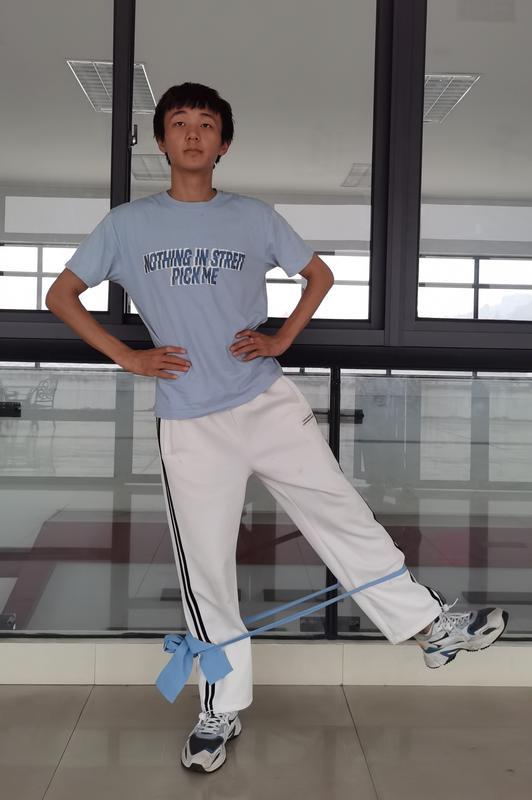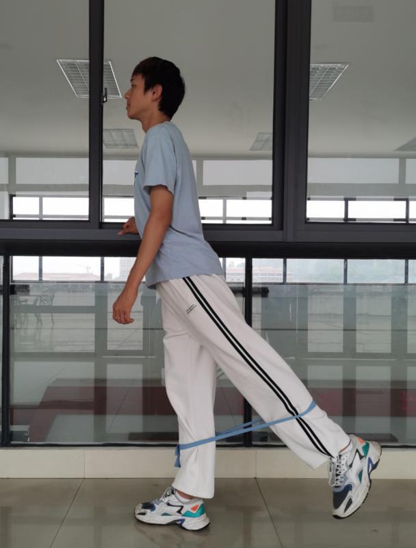 4.彈力帶后/側(cè)踢腿:主要鍛煉下肢肌群。將彈力帶綁成環(huán)狀,或使用彈力環(huán),固定在小腿上,一側(cè)手可扶墻保持穩(wěn)定。呼氣時,單側(cè)腿用力向后踢腿到極限位置,保持上半身穩(wěn)定,不要大幅度晃動;吸氣時還原,注意動作速度放慢,感受臀腿的發(fā)力感。