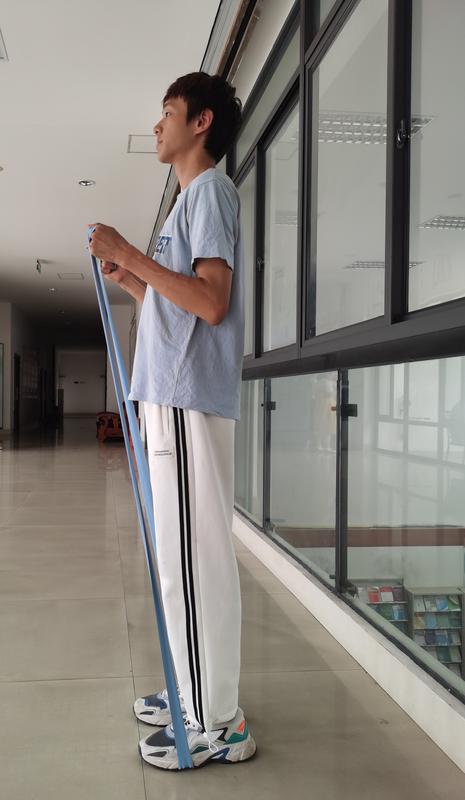 2.彈力帶頸后臂屈伸:主要鍛煉上肢肱三頭肌。雙腳打開與盆胯同寬,將彈力帶的一端踩在腳下,雙手握緊另一端。保持雙手臂屈肘置于頸后,呼氣用力向上提拉彈力帶,吸氣緩慢還原。