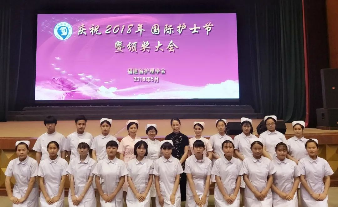 黃炎珍(第二排左三)和精準(zhǔn)扶貧班同學(xué)參加福建省國際護(hù)士節(jié)慶祝大會(huì)暨頒獎(jiǎng)典禮