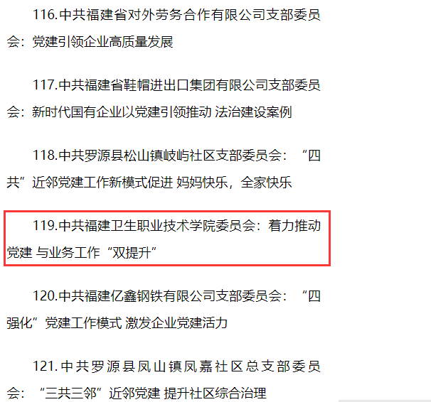 為宣傳貫徹落實(shí)習(xí)近平總書記在福建考察時(shí)的重要講話精神,人民網(wǎng)福建頻道聯(lián)合中共福建省委組織部、中共福建省委黨校、福建行政學(xué)院、中共福建省委教育工作委員會(huì)、中共福建省人民政府國有資產(chǎn)監(jiān)督管理委員會(huì)委員會(huì)、中國電信股份有限公司福建分公司,自2021年4月始,面向福建全省各領(lǐng)域基層黨組織,開展“福建省新時(shí)代黨建品牌、優(yōu)秀案例征集”活動(dòng)。經(jīng)過第一輪篩選,選出案例共896個(gè)。現(xiàn)將初選名單予以公布。(按所在地分類)