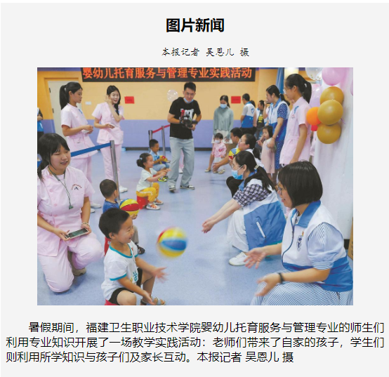 暑假期間,福建衛(wèi)生職業(yè)技術(shù)學(xué)院嬰幼兒托育服務(wù)與管理專業(yè)的師生們利用專業(yè)知識(shí)開展了一場(chǎng)教學(xué)實(shí)踐活動(dòng):老師們帶來(lái)了自家的孩子,學(xué)生們則利用所學(xué)知識(shí)與孩子們及家長(zhǎng)互動(dòng)。本報(bào)記者 吳恩兒 攝