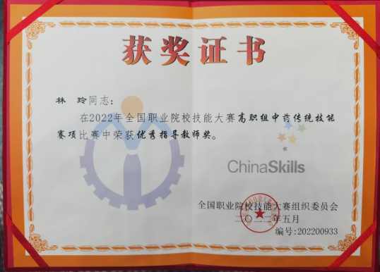 賽中,學(xué)校藥學(xué)院領(lǐng)導(dǎo)線上線下一路悉心陪護(hù),為選手在比賽中做好心理輔導(dǎo),不斷調(diào)整最佳狀態(tài),最終選手以扎實(shí)的專(zhuān)業(yè)水平與規(guī)范的技能操作,從全國(guó)51支參賽隊(duì)伍中脫穎而出,一舉獲得全國(guó)一等獎(jiǎng)的優(yōu)異成績(jī),林玲老師獲得“優(yōu)秀輔導(dǎo)教師”稱(chēng)號(hào)。