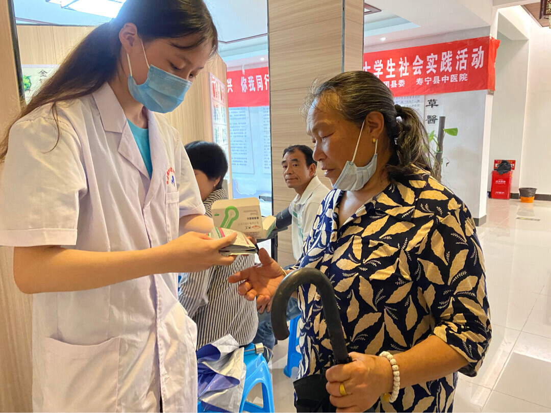 圖為小隊(duì)成員為前來體驗(yàn)的村民發(fā)放醫(yī)療物品。中國青年網(wǎng)通訊員 趙夢(mèng)雅 攝