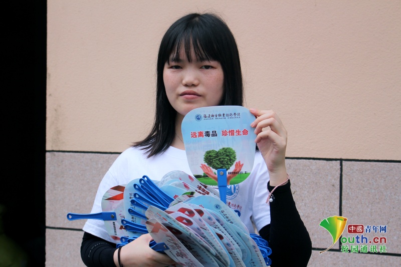 圖為實(shí)踐隊(duì)員在派發(fā)遠(yuǎn)離毒品宣傳扇子 中國青年網(wǎng)通訊員 詹微微 攝