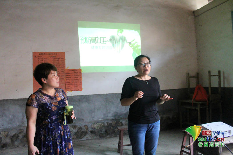 圖為指導(dǎo)老師為村民做預(yù)防高血壓的宣講 中國青年網(wǎng)通訊員 詹微微 攝