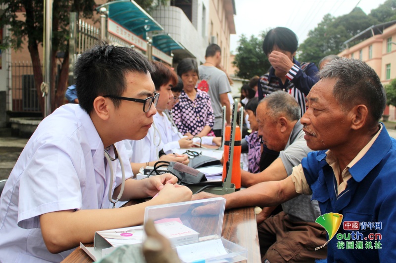 圖為指導(dǎo)老師為村民測量血壓 中國青年網(wǎng)通訊員 詹微微 攝