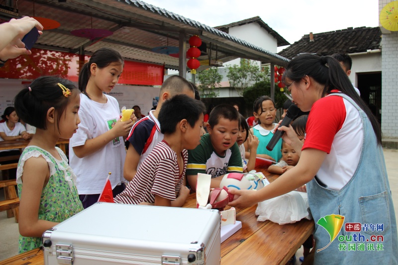 給小朋友發(fā)放書本等學(xué)習(xí)用品,教導(dǎo)小朋友要努力學(xué)習(xí),爭當新時代接班人。中國青年網(wǎng)通訊員 方江財 攝