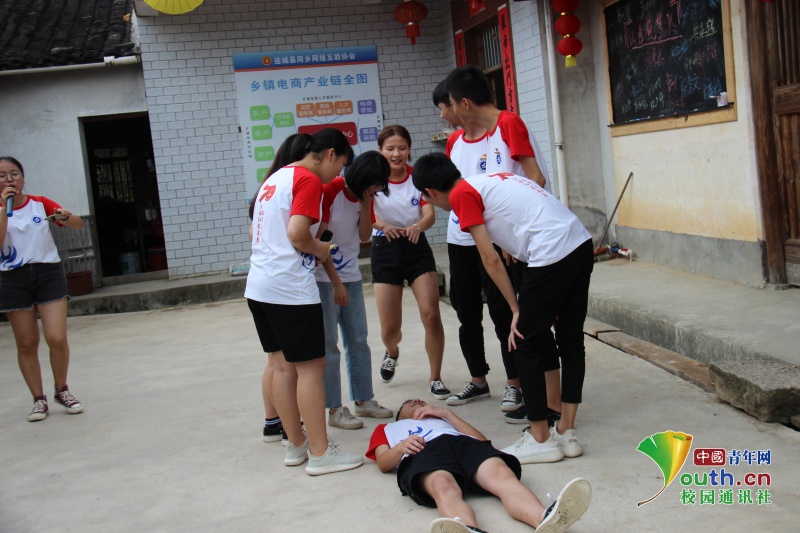 志愿者扮演心臟病突發(fā)的患者,來向小朋友和現(xiàn)場的家長們展示如何進行救援行動。中國青年網(wǎng)通訊員 方江財 攝