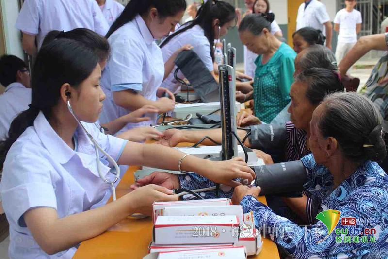 7月4日成員們在嶺腰村提供愛心醫(yī)療,老人因有脊椎病而行動不便,成員們?yōu)樗峁┝税喂蕖V袊嗄昃W(wǎng)通訊員 吳雪兒 攝