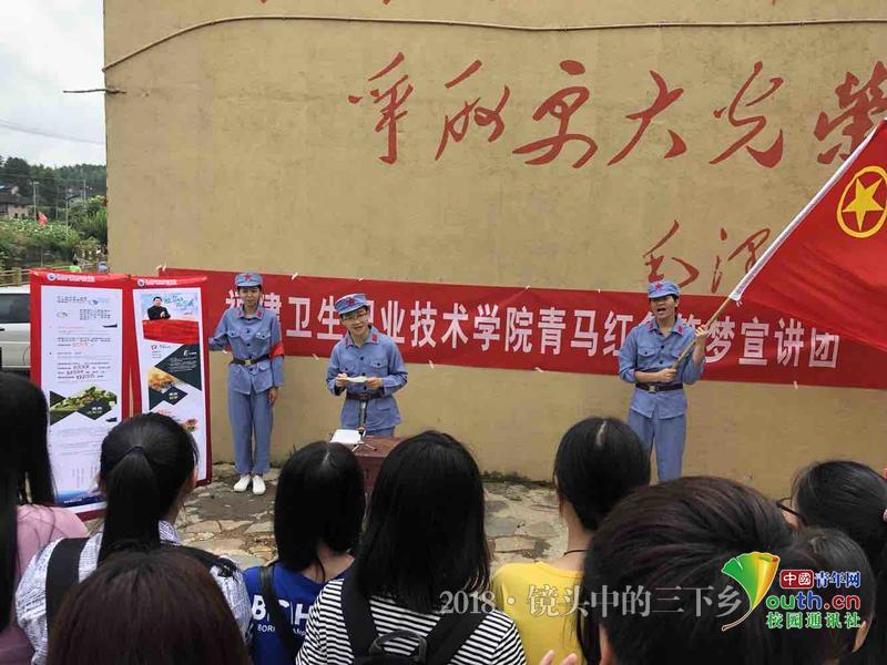 7月3日在水尾村禮堂前房鑫宣講習(xí)近平強軍思想,同學(xué)們穿上紅軍服,更深刻感受到了革命先輩的艱辛付出及當(dāng)代強軍夢重要性。中國青年網(wǎng)通訊員 吳雪兒 攝