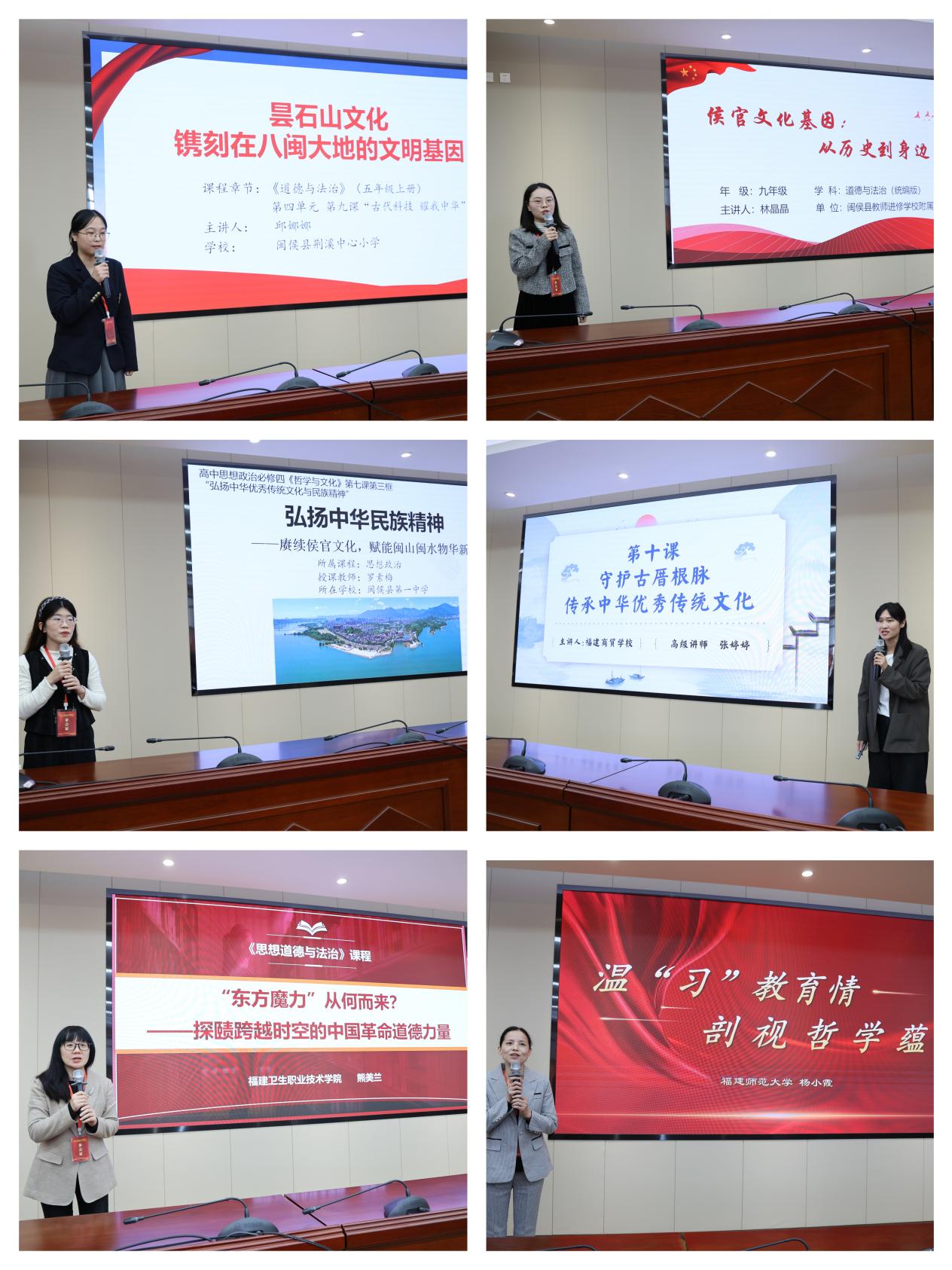 教學(xué)展示由我校馬克思主義學(xué)院黨總支書記、院長熊美蘭主持。來自福建師范大學(xué)、福建衛(wèi)生職業(yè)技術(shù)學(xué)院、福建商貿(mào)學(xué)校、閩侯縣第一中學(xué)、閩侯縣教師進(jìn)修學(xué)校附屬中學(xué)、閩侯縣荊溪中心小學(xué)的6位教師循著“小學(xué)啟蒙、中學(xué)深化、職教專精、大學(xué)引領(lǐng)”的育人路徑依次登臺,結(jié)合習(xí)近平與福建文化的情緣、侯官文化、曇石山文化等內(nèi)容,用各具特色的教學(xué)設(shè)計詮釋習(xí)近平文化思想與福建特色文化的融合路徑。