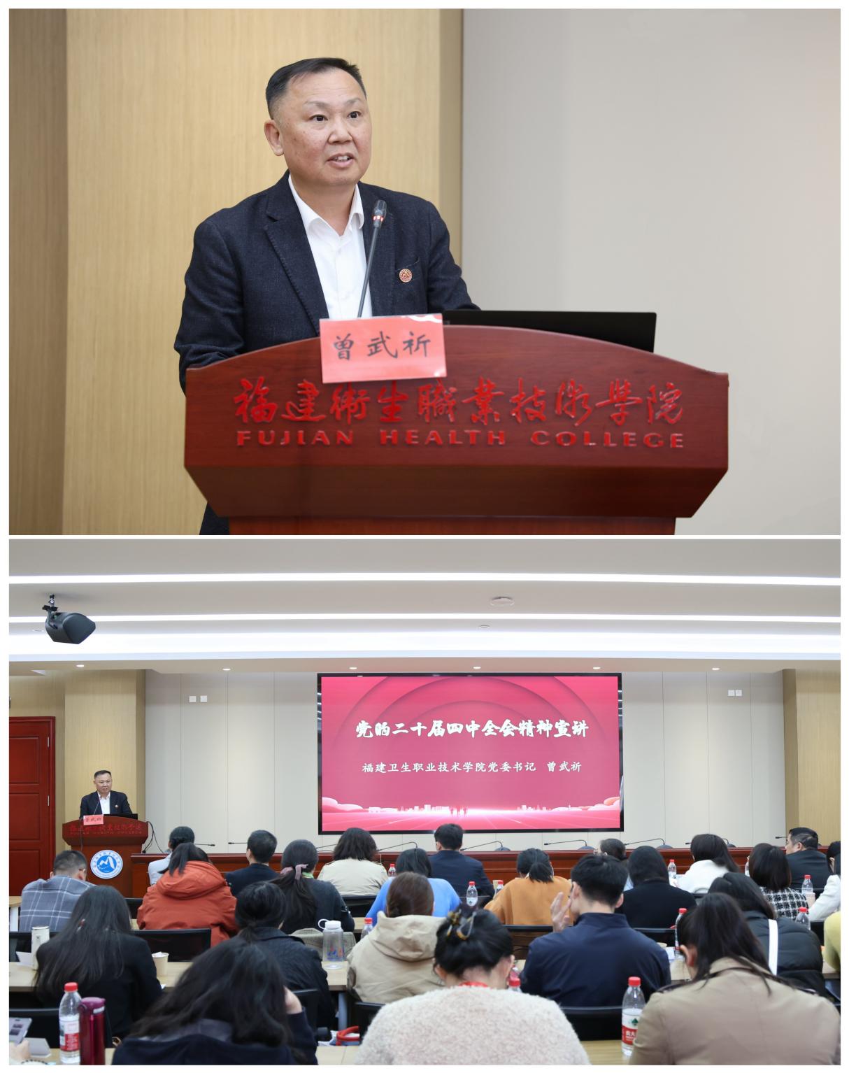 (圖:福建衛(wèi)生職業(yè)技術(shù)學(xué)院校黨委書記曾武祈作黨的二十屆四中全會精神宣講)