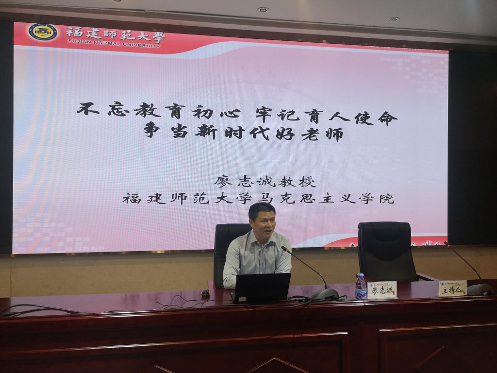 在思想政治教育專題講座中,福建師范大學(xué)廖志誠教授以“不忘教育初心,牢記育人使命——爭當(dāng)新時代好老師”為主題,深入闡述了“四有”教師的深刻內(nèi)涵,他表示,青年教師要多奉獻(xiàn),多付出,用心育人,以愛育才。