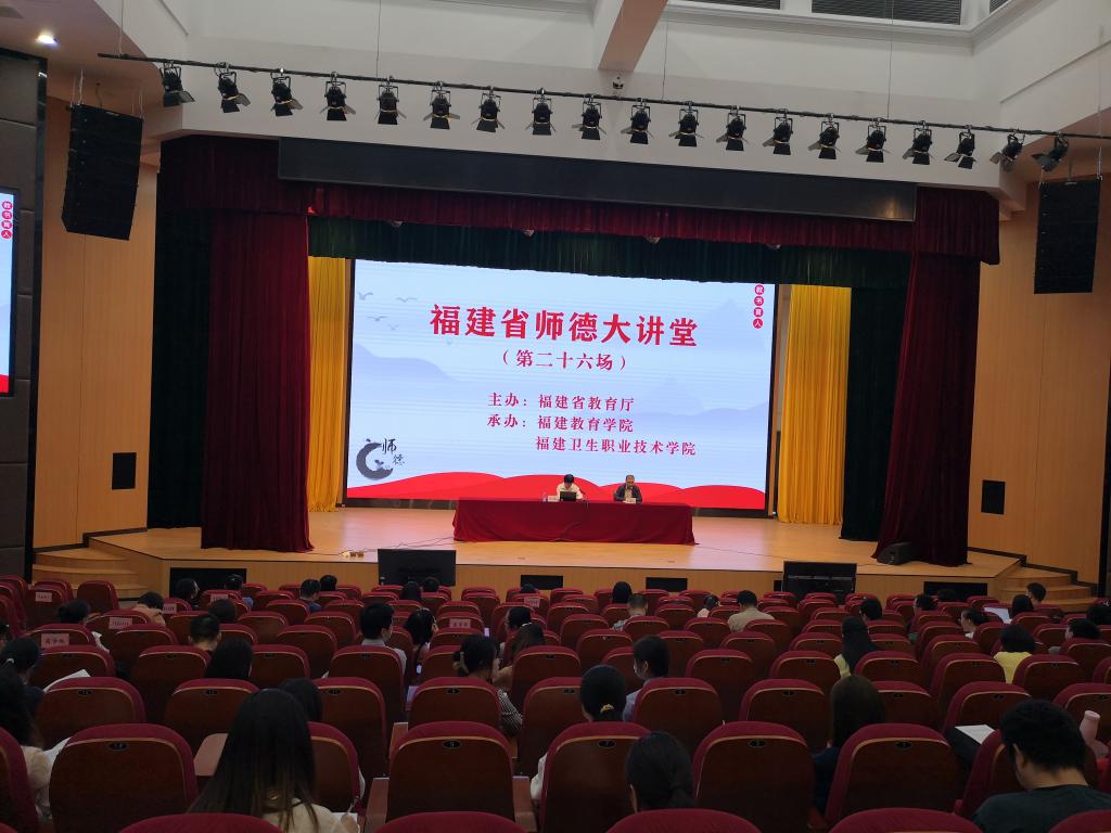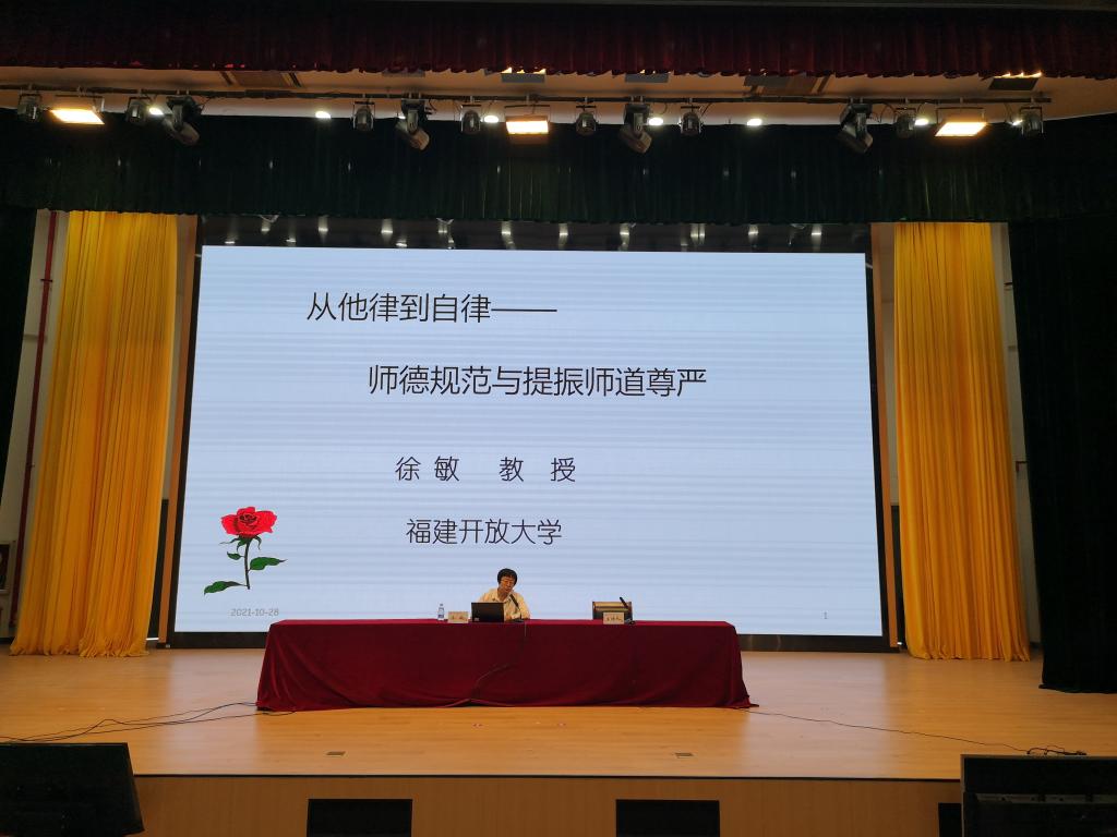 在師德師風(fēng)專題講座中,福建開放大學(xué)徐敏教授以“從他律到自律——師德修養(yǎng)與提振師道尊嚴(yán)”為主題,從教育部相關(guān)文件的重要意義及身邊的師德典型入手,分析教師職業(yè)規(guī)則和特點,并從師愛、師業(yè)、師能、師德、師魂五個方面具體闡述教師價值定位和要求。她強調(diào),師有道,師有德,師有則才是一名教師最理想的狀態(tài),才能最終體現(xiàn)教師的幸福感。