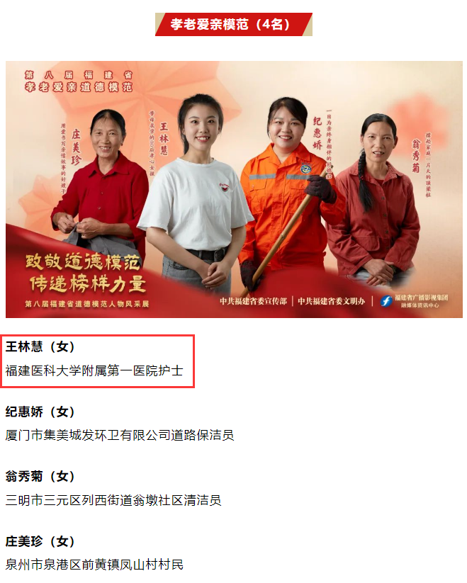 近日,福建省精神文明建設指導委員會印發(fā)《關于表彰第八屆福建省道德模范的決定》,我校22屆護理專業(yè)校友王林慧獲“孝老愛親模范”榮譽稱號。