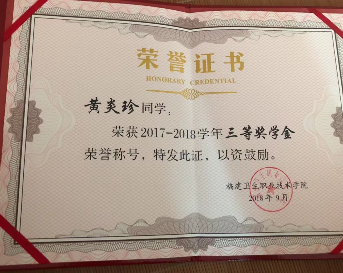 在大學(xué)期間,黃炎珍總是以飽滿的熱情迎接生活及學(xué)業(yè)的挑戰(zhàn),她目標(biāo)明確,憑借著勤奮刻苦的學(xué)習(xí)態(tài)度和追求卓越的強(qiáng)大動(dòng)力取得了優(yōu)異成績(jī),榮獲2017-2018學(xué)年“三等獎(jiǎng)學(xué)金”、2017-2018學(xué)年“優(yōu)秀學(xué)生干部”等榮譽(yù)。