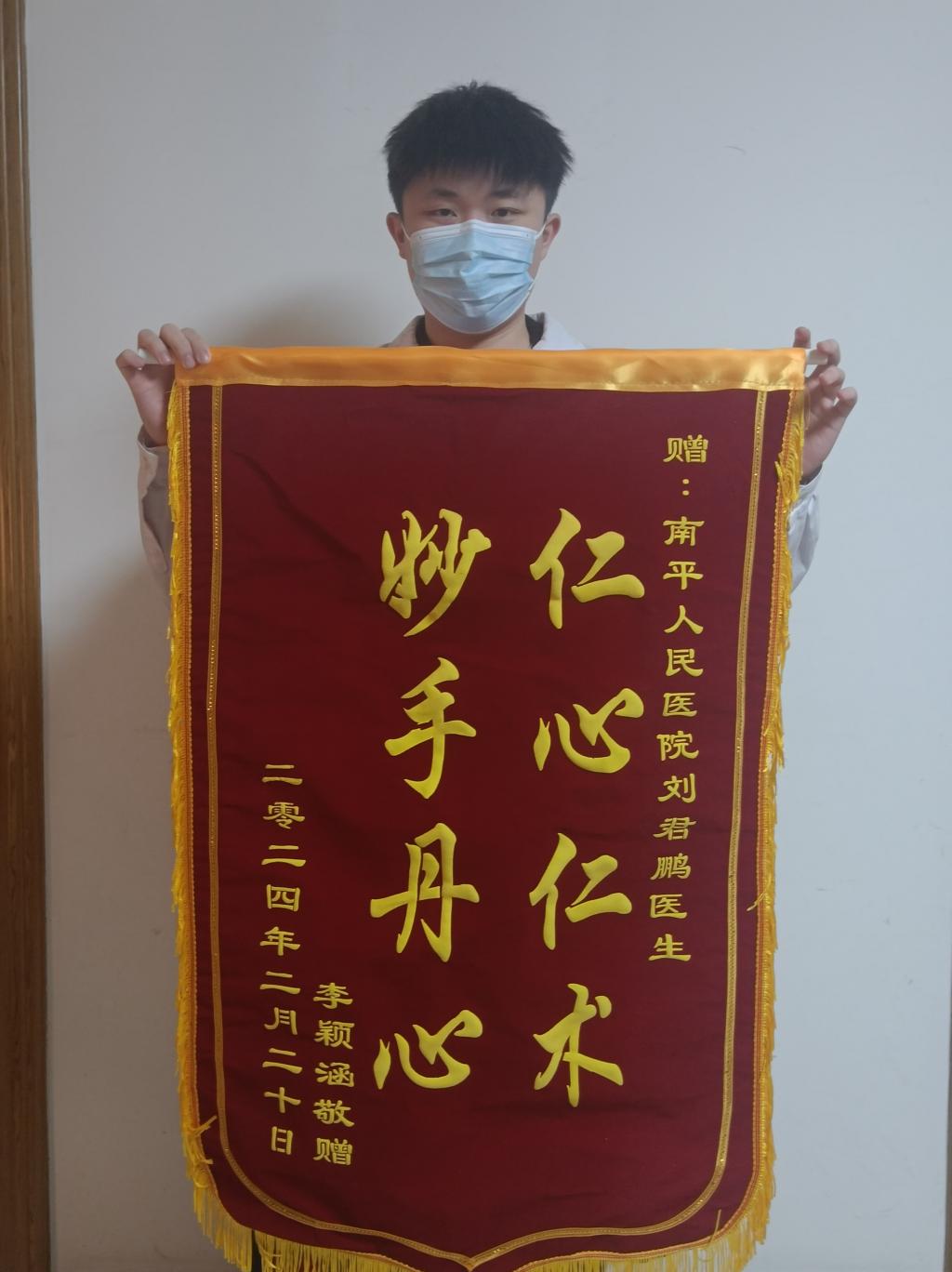 送錦旗的患者被腱鞘囊腫反復(fù)發(fā)作折磨一年余,同時(shí)伴有失眠、便秘,曾多方就醫(yī),治療效果均不明顯,遂至南平市人民醫(yī)院就診。治療期間,劉君鵬同學(xué)耐心疏導(dǎo)患者情緒,解釋病因病機(jī),詳盡問診辨證論治。通過其細(xì)致嫻熟的針灸推拿手法,配合中藥治療,在短短一周后,患者可日行上萬步,同時(shí)睡眠、便秘問題也隨之解決。劉君鵬同學(xué)用仁心仁術(shù)幫助患者解決了困擾多時(shí)的難題,展現(xiàn)了閩衛(wèi)學(xué)子扎實(shí)過硬的專業(yè)能力和仁而愛人的醫(yī)者初心。