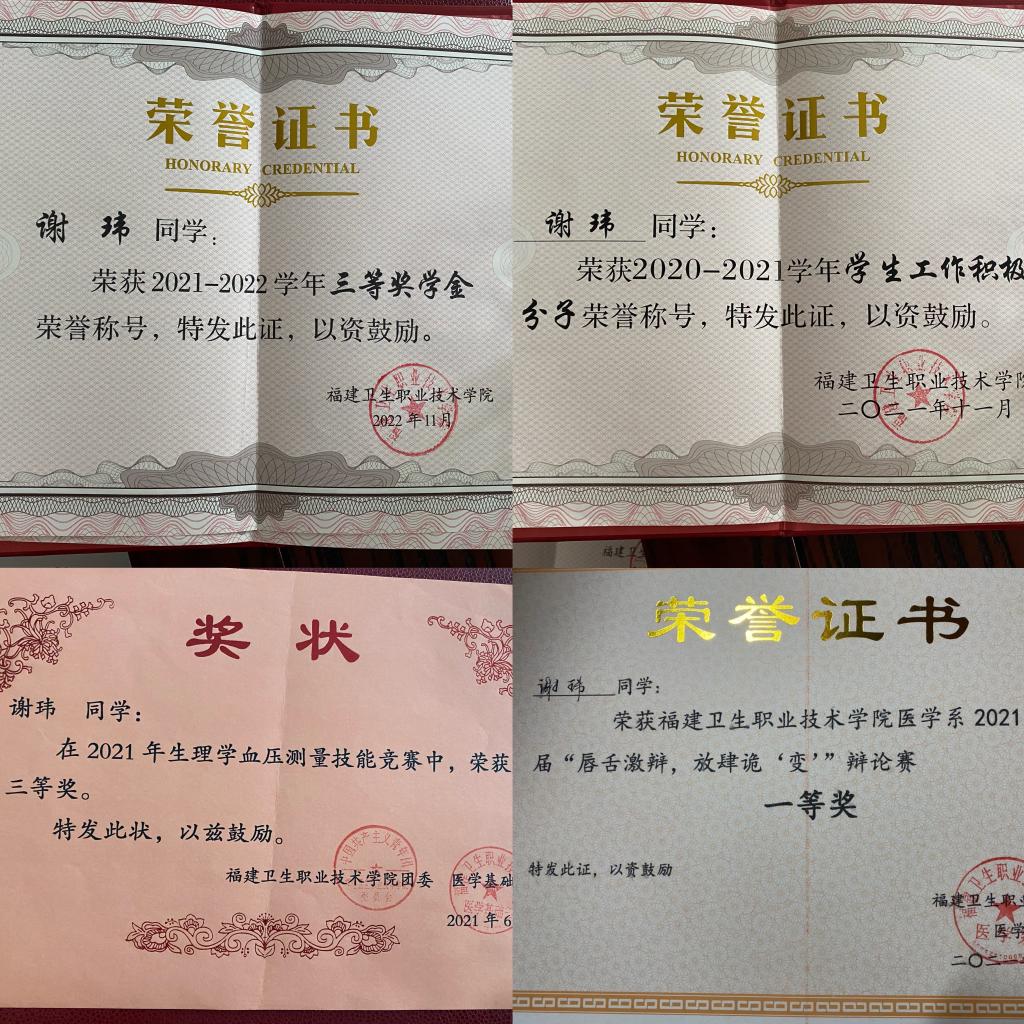 ?成為一名醫(yī)生,是謝瑋從小的夢想。帶著這份初心,她考入福建衛(wèi)生職業(yè)技術學院臨床醫(yī)學專業(yè),開啟了醫(yī)學追夢之路。在校期間,她始終牢記入學第一天所學的“技在高,更在德;術在巧,更在仁。看的是病,救的是心;開的是藥,給的是情。”的醫(yī)者信條,用赤誠的學醫(yī)之心和奉獻精神在校園中不斷積累,刻苦學習專業(yè)知識,積極參與校園活動,擔任班級學習委員,服務同學,提升自我。她不僅在學業(yè)上表現優(yōu)異,還獲得了辯論賽一等獎、“學生工作積極分子”等榮譽,展現了全面發(fā)展的青春風采。
