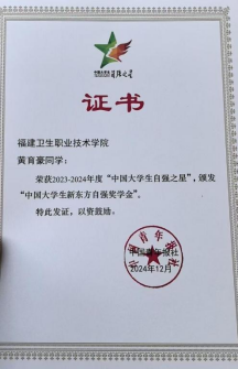 黃育豪,男,漢族,中共預備黨員,福建衛(wèi)生職業(yè)技術學院22級臨床醫(yī)學(高本貫通)602班學生,曾任班級副班長,現擔任福清市醫(yī)院實習隊長。學習期間,先后獲得國家級、省級獎項6項。近期,在由共青團中央、中華全國學生聯合會指導,中國青年報社、新東方教育科技集團、中國青年創(chuàng)業(yè)就業(yè)基金會聯合開展的2023-2024年度“中國大學生自強之星”評選中榮獲“中國大學生自強之星”榮譽稱號。