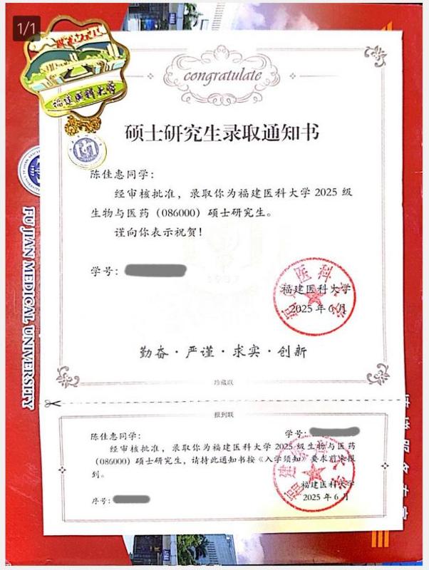 “??剖俏业钠瘘c(diǎn),但不是終點(diǎn)。”懷揣對(duì)醫(yī)藥研究的熱情,陳佳惠從踏入閩衛(wèi)院的第一天起就制定了清晰的升學(xué)規(guī)劃。她堅(jiān)持“晨6晚11”的學(xué)習(xí)節(jié)奏,為攻克英語短板,她堅(jiān)持每天打卡單詞,這份執(zhí)著讓她連續(xù)兩年榮獲一等獎(jiǎng)學(xué)金,通過專升本考試。專升本后,面對(duì)全新的生物技術(shù)領(lǐng)域,陳佳惠展現(xiàn)出驚人的適應(yīng)能力,學(xué)習(xí)好專業(yè)知識(shí)之余加入老師的實(shí)驗(yàn)室進(jìn)行實(shí)驗(yàn)技能的學(xué)習(xí);備考研究生期間,把圖書館當(dāng)作“家”。