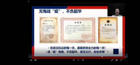 接著,危艷萍向大家生動(dòng)細(xì)致的分享自己的“從戰(zhàn)”經(jīng)歷,2020年2月12日遞交請戰(zhàn)書,2月13日晚接到第二天就要出發(fā)武漢的通知,疫情就是命令,防控就是責(zé)任,她和眾多醫(yī)護(hù)工作者一樣,毫不猶豫的踏上奔赴武漢的戰(zhàn)場。剛到武漢時(shí),防護(hù)物資還很緊張,沒有靴套就用醫(yī)療垃圾袋,外科手套不足就用檢查手套,到后來防護(hù)物資才逐漸充裕。令危艷萍最難忘的還是穿著防護(hù)服每天工作7、8個(gè)小時(shí),衣服干了又濕,濕了又干。防護(hù)口罩勒的耳朵感覺快要掉了,護(hù)目鏡壓得鼻梁、顴骨持續(xù)疼痛,厚厚的防護(hù)服悶得她喘不上氣。那些平時(shí)簡單輕松就能完成的工作變得困難重重,干什么都有費(fèi)力感。人也容易疲勞,有一次蹲下休息,差點(diǎn)站不起來,但忙起來所有的不適也就忘了。