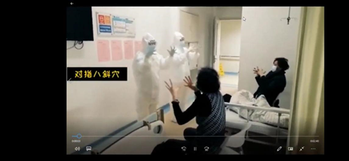 課程一開始,危艷萍為大家播放一段視頻“一、二、三,吸氣……”“記住,有個(gè)要點(diǎn),吸三秒,呼六秒……”,視頻中是危艷萍在指導(dǎo)新冠肺炎病人做呼吸操。教病人做呼吸操,并不在援鄂醫(yī)療隊(duì)對新冠肺炎病人的護(hù)理職責(zé)范圍之內(nèi),但是作為一名專業(yè)護(hù)士,一位熱愛護(hù)理事業(yè)的白衣天使,危艷萍覺得,只要對患者康復(fù)有益,做什么都可以,教病人做呼吸操,在防護(hù)服背后寫心靈雞湯,使用精油為病人安眠,組員為病人手繪64幅加油小插畫,這些精神上的慰藉有效的拉近了醫(yī)護(hù)人員與病人之間的距離,只為讓病人心情愉快,更快的戰(zhàn)勝病魔。
