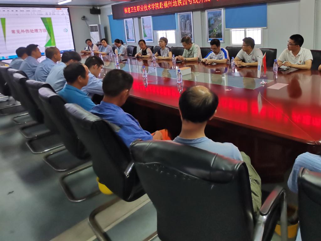 參觀結(jié)束后,藥學(xué)院第二黨支部全體黨員、中建海峽四號線工程項目黨支部全體黨員及技術(shù)骨干齊聚項目部會議室,聆聽藥學(xué)院副院長李泳寧同志和藥理教研室主任潘雪豐同志帶來的健康知識小講座。