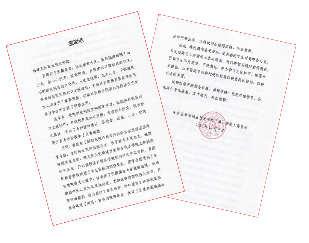 昌都市職業(yè)技術(shù)學(xué)校黨委委員、副校長(zhǎng)蔣昆對(duì)我校的愛心捐助表示衷心感謝,他指出,這份跨越千山萬水的愛心不僅給困難家庭學(xué)生帶來一定的經(jīng)濟(jì)幫助,更使廣大學(xué)生感受到了來自福建衛(wèi)生職業(yè)技術(shù)學(xué)院的深切關(guān)心,讓全體師生倍感溫暖、倍受鼓舞,充分體現(xiàn)了閩昌一家親的深情厚誼和發(fā)展共贏造福社會(huì)的使命擔(dān)當(dāng),將激勵(lì)學(xué)生以更加認(rèn)真的態(tài)度、更加飽滿的激情投入文化知識(shí)學(xué)習(xí),練強(qiáng)專業(yè)技能,以豐富的學(xué)識(shí)和過硬的技能為祖國、為社會(huì)做出積極貢獻(xiàn)。同時(shí),中共昌都市職業(yè)技術(shù)學(xué)校(第二職校)委員會(huì)向我校發(fā)來一封感謝信。