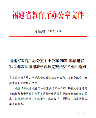 近日,福建省教育廳公布2021年福建省軍事課教師微課教學(xué)視頻競(jìng)賽獲獎(jiǎng)名單。我校馬克思主義學(xué)院就業(yè)指導(dǎo)和軍事理論教研室張崇飛、楊央兩位老師的參賽作品脫穎而出,分別獲得高校組二等獎(jiǎng)、三等獎(jiǎng)。