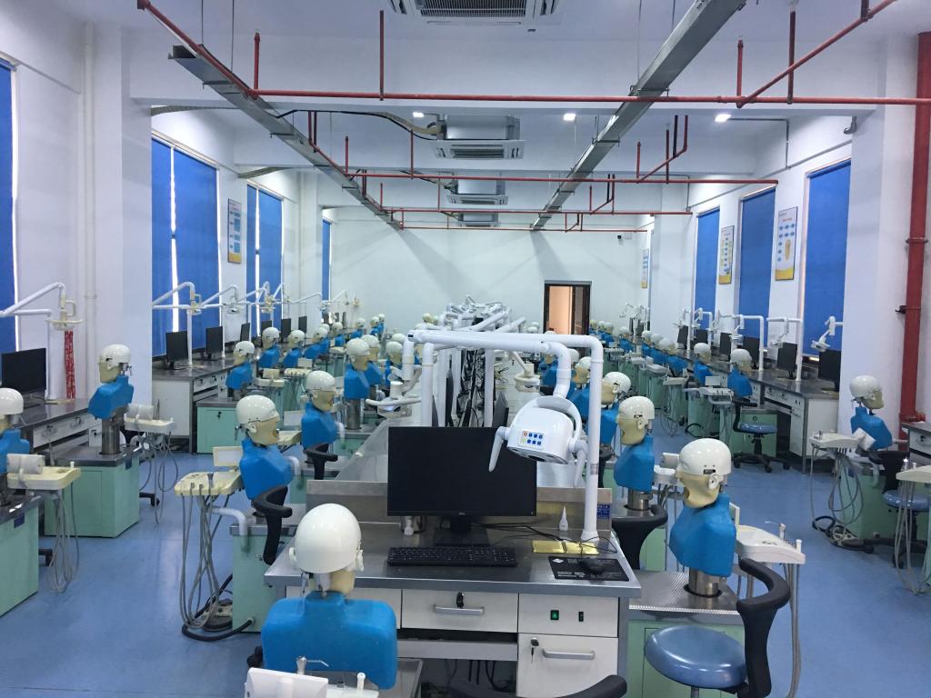 校內(nèi)實訓(xùn)基地面積達700平方米,包含口腔綜合實訓(xùn)室、口腔模擬診室、口腔修復(fù)工藝室及門診部口腔科等,擁有100套對接臨床的仿頭模教學(xué)系統(tǒng),教學(xué)設(shè)備總值為800多萬元,為學(xué)生開展各項實訓(xùn)對接口腔臨床工作任務(wù)提供了堅實的基礎(chǔ)。