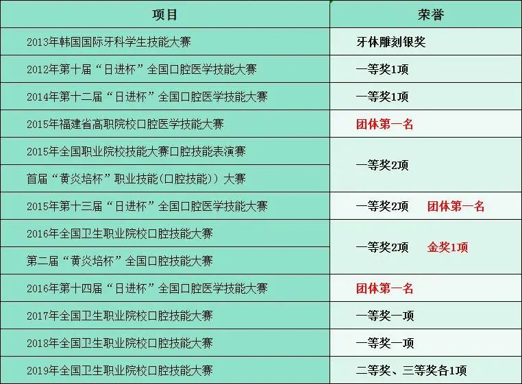 近年來,學(xué)生在各級別口腔醫(yī)學(xué)技能大賽上共獲37個獎項,包括國際銀獎1項、全國金獎1項、全國一等獎10項、2次全國團體第一名、1次省級團體第一名。學(xué)生獲第五屆國際口腔技師學(xué)術(shù)大會(韓國)口腔醫(yī)學(xué)技術(shù)專業(yè)石膏牙雕刻銀獎(第二名),是第一個在該項國際比賽中獲獎的中國學(xué)生,實現(xiàn)了中國零的突破。