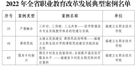 近日,福建省職業(yè)技術(shù)教育中心公布2022年全省職業(yè)教育改革發(fā)展典型案例名單。我校報(bào)送的《三針對、三突破、三元共育——醫(yī)學(xué)影像技術(shù)專業(yè)實(shí)踐教學(xué)體系的創(chuàng)建與實(shí)踐》(醫(yī)學(xué)技術(shù)系)、《五措五促抓建設(shè)課程思政結(jié)碩果——福建衛(wèi)生職業(yè)技術(shù)學(xué)院課程思政建設(shè)實(shí)踐經(jīng)驗(yàn)總結(jié)》(藥學(xué)院)、《強(qiáng)化鄉(xiāng)村醫(yī)生技能培訓(xùn),全面提升基層醫(yī)療服務(wù)水平——福建省鄉(xiāng)村醫(yī)生規(guī)范培訓(xùn)項(xiàng)目案例》(繼續(xù)教育學(xué)院)三個(gè)案例分別入選“產(chǎn)教融合”“課程思政”“服務(wù)鄉(xiāng)村振興”類型典型案例。