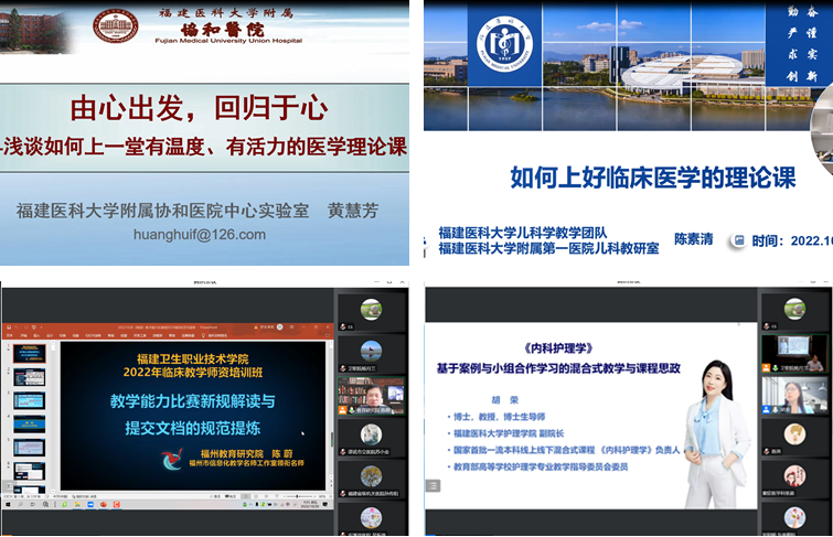 本次培訓(xùn)班邀請了福建醫(yī)科大學(xué)附屬協(xié)和醫(yī)院黃慧芳、福建醫(yī)科大學(xué)附屬第一醫(yī)院陳素清、福州教育研究院陳蔚、福建醫(yī)科大學(xué)胡榮4位教學(xué)經(jīng)驗豐富、專業(yè)水平過硬的專家做專題講座,授課主題分別為《由心出發(fā),回歸于心-淺談如何上一堂有溫度有活力的醫(yī)學(xué)理論課》《如何設(shè)計臨床醫(yī)學(xué)的理論課》《教學(xué)能力比賽新規(guī)解讀與提交文檔的規(guī)范提煉》《基于案例與小組合作學(xué)習(xí)的線上線下混合式教學(xué)》。授課內(nèi)容既有教學(xué)設(shè)計的訣竅,也有課程實施的技巧,既有混合式教學(xué)的案例解析,也有溫度活力兼?zhèn)涞尼t(yī)學(xué)倫理授課經(jīng)驗分享,培訓(xùn)內(nèi)容豐富且接地氣。