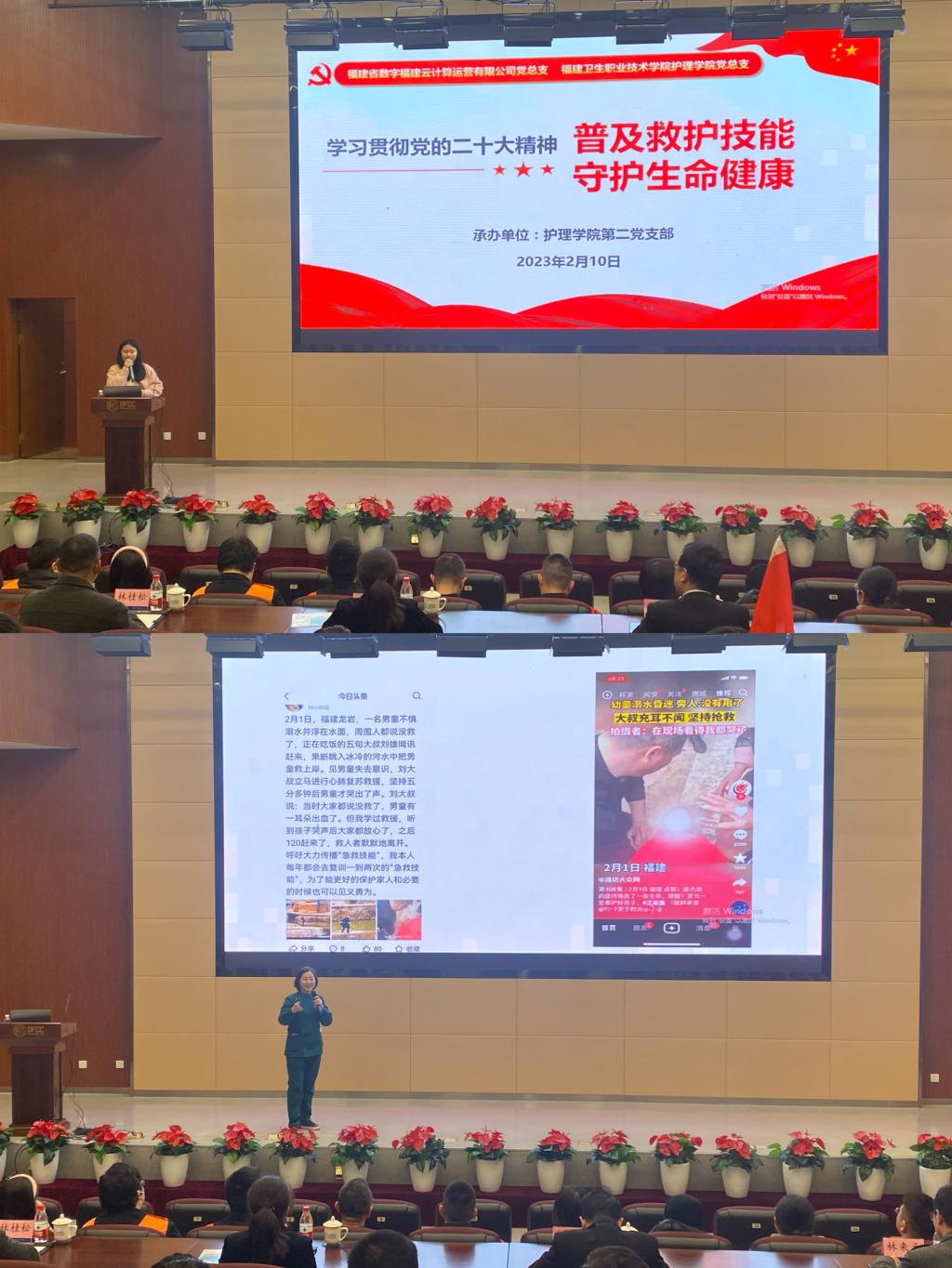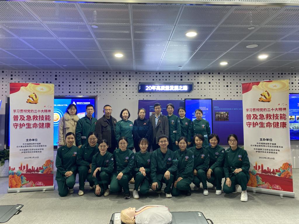 為進(jìn)一步普及應(yīng)急救護(hù)常識(shí),提高全民自救互救能力,樹(shù)立“人人學(xué)急救,急救為人人”的理念。2月10日,護(hù)理學(xué)院黨總支副書(shū)記、院長(zhǎng)龔海蓉一行帶領(lǐng)第二黨支部全體黨員教師走進(jìn)黨建共建單位數(shù)字福建云計(jì)算中心,開(kāi)展“學(xué)習(xí)貫徹黨的二十大精神 普及急救技能 守護(hù)生命健康”的主題黨日活動(dòng),數(shù)字福建云計(jì)算中心董事長(zhǎng)郭孔武、總經(jīng)理陳莉琳等120余名員工參加本次培訓(xùn)。
