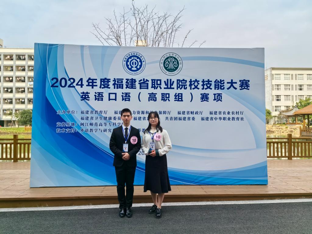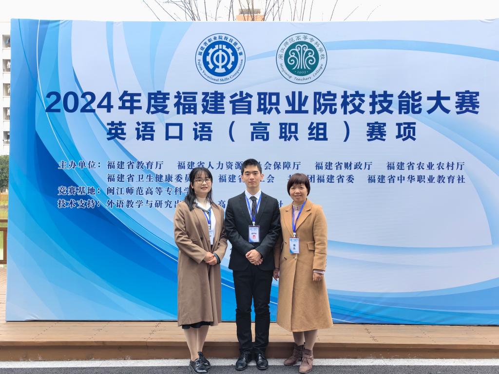 12月29日至31日,2024年福建省職業(yè)院校技能大賽高職組“英語(yǔ)口語(yǔ)”賽項(xiàng)在閩江師范高等??茖W(xué)校舉行。此次競(jìng)賽分為英語(yǔ)專業(yè)組和非專業(yè)組,賽制由以往的“學(xué)生個(gè)人賽”轉(zhuǎn)變?yōu)椤皫熒悺薄F渲蟹菍I(yè)組共有來(lái)自全省40多所高職院校的師生隊(duì)伍參加。我校2022級(jí)護(hù)理315班黃道凱同學(xué)和人文教學(xué)部外語(yǔ)教研室盧叢珊老師經(jīng)過(guò)兩個(gè)多月的賽前培訓(xùn),在比賽中團(tuán)結(jié)協(xié)作,榮獲非專業(yè)組二等獎(jiǎng)。