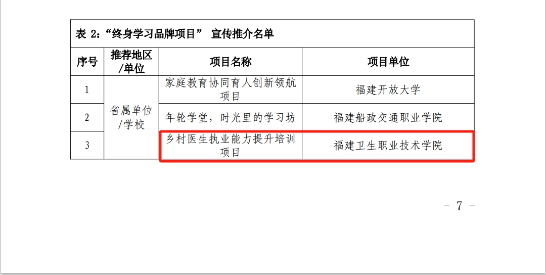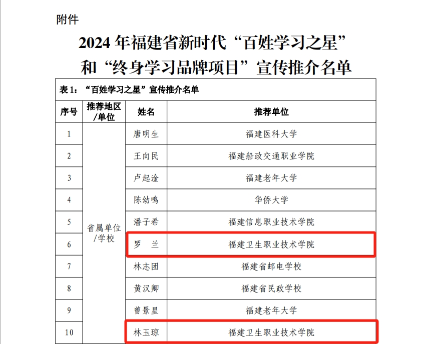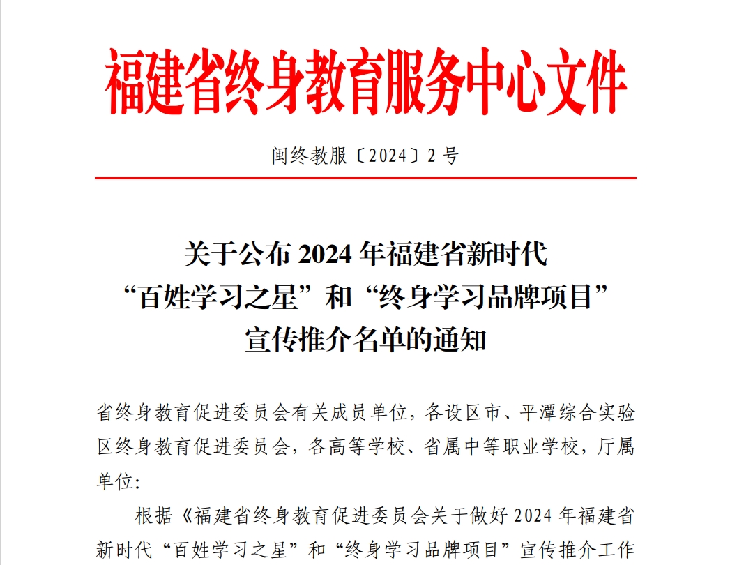 近日,福建省終身教育促進委員會公布2024年福建省新時代“百姓學習之星”和“終身學習品牌項目”推介名單,我校醫(yī)學院林玉瓊老師、藥學院羅蘭老師入選2024年福建省新時代“百姓學習之星”;繼續(xù)教育學院申報項目《鄉(xiāng)村醫(yī)生執(zhí)業(yè)能力提升培訓項目》入選2024年福建省新時代“終身學習品牌項目”。