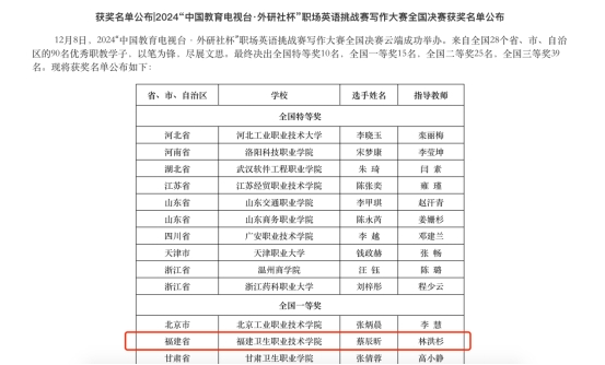 近日,2024“中國教育電視臺·外研社杯”職場英語挑戰(zhàn)賽寫作大賽國賽正式落幕,我校醫(yī)學院蔡辰昕同學從全國28個省、市、自治區(qū)的眾多優(yōu)秀選手中脫穎而出,榮獲英語寫作大賽全國決賽一等獎。