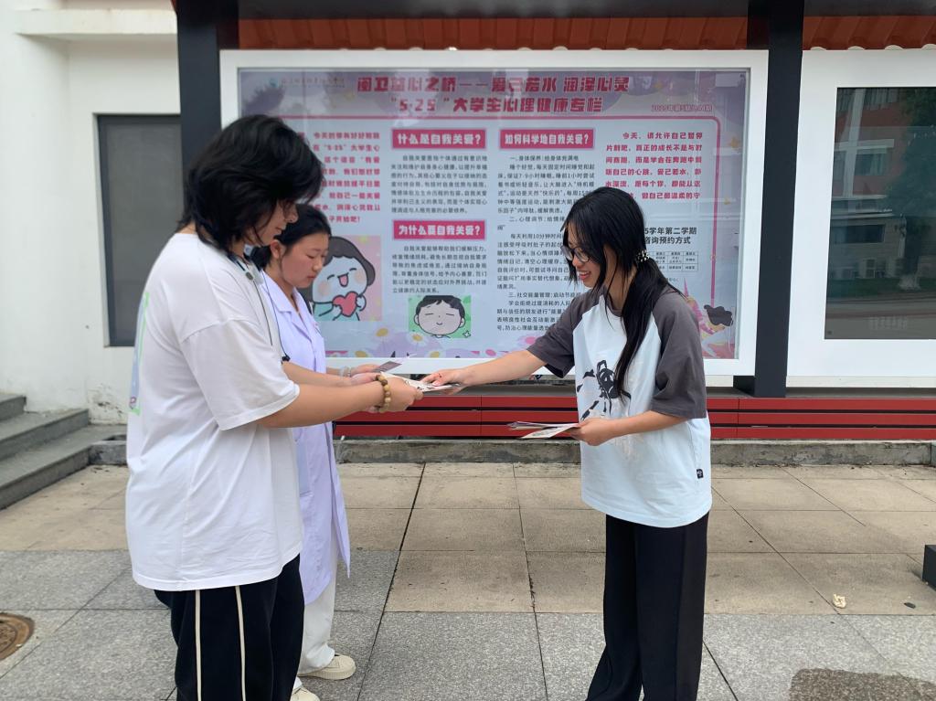 5月中下旬,校心理朋輩在心理健康教育中心開(kāi)展現(xiàn)場(chǎng)宣教,發(fā)放情緒管理和自我關(guān)愛(ài)的科普宣傳手冊(cè)、展示心理宣教系列活動(dòng)成果,為同學(xué)提供專業(yè)的心理調(diào)適建議,發(fā)揮朋輩力量,傳播心理正能量。