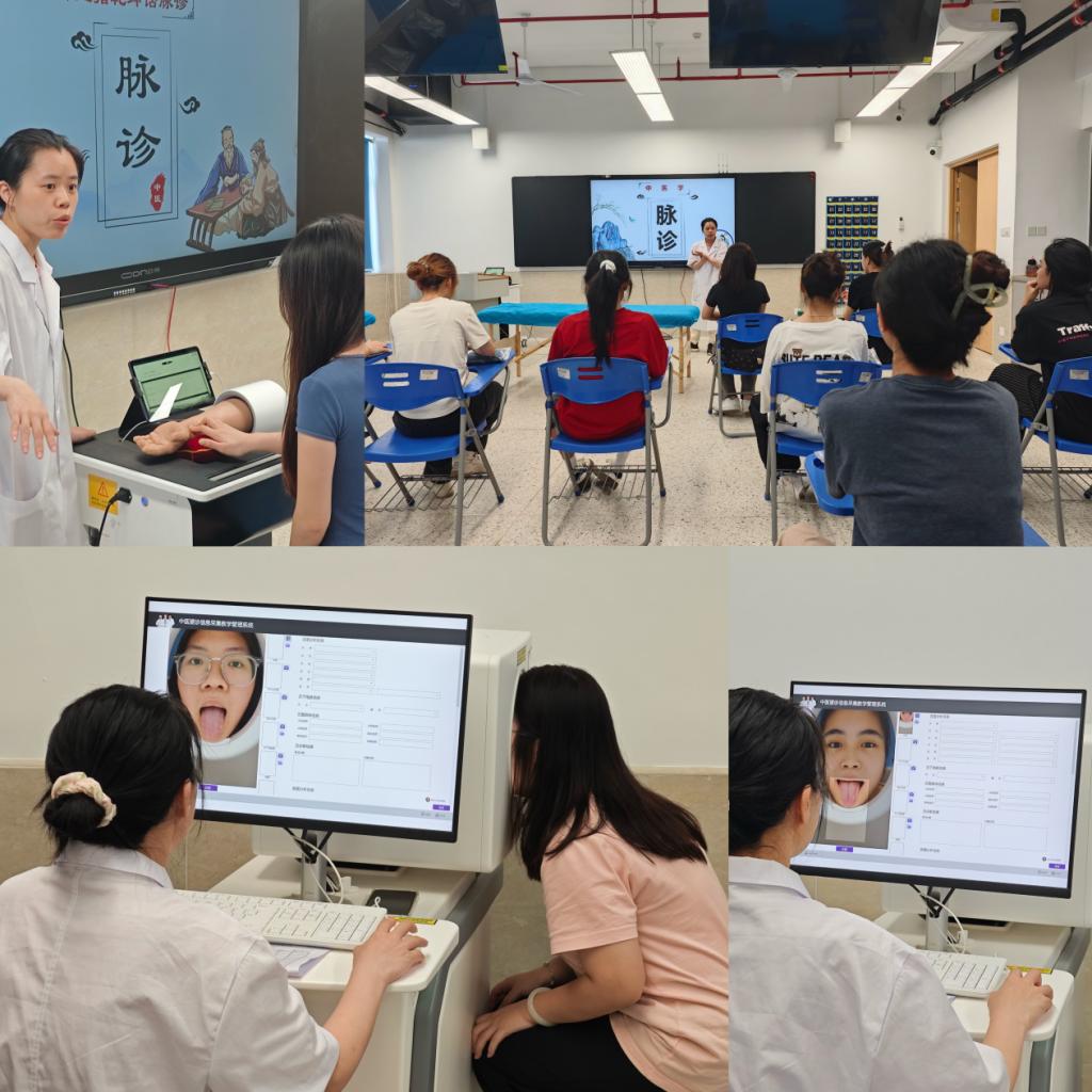 本次教學(xué)歷時近兩周,醫(yī)學(xué)院針灸推拿專業(yè)聯(lián)合中藥學(xué)、中醫(yī)學(xué)等專業(yè)共同實施,采用“理論講授+沉浸體驗”的教學(xué)方式,圍繞中醫(yī)藥適宜技術(shù)+中醫(yī)基礎(chǔ)理論+中醫(yī)藥文化展開授課。在推拿實訓(xùn)教室,兩兩分組學(xué)習(xí)腧穴定位、推拿手法、毫針刺法、刮痧、耳穴壓貼等常用中醫(yī)適宜技術(shù),切身體會“以手代藥”的中醫(yī)智慧。在傳統(tǒng)功法教學(xué)部分,學(xué)員習(xí)練“八段錦”,掌握調(diào)息養(yǎng)生要點。此外,課程還特別開設(shè)了舌診與脈診學(xué)習(xí)模塊,教師借助儀器直觀展示舌象、脈象特征,增強(qiáng)學(xué)員的學(xué)習(xí)理解和操作感知。